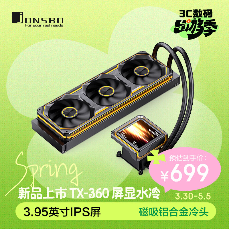 IT之家 4 月 3 日消息,乔思伯旗下 TX-360 水冷散热器目前已在京东发售,该型号拥有内嵌方形屏幕的铝壳触点磁吸固定冷头装饰模块,搭载 XA-360“光影之刃”联体风扇,定价为 699 元。