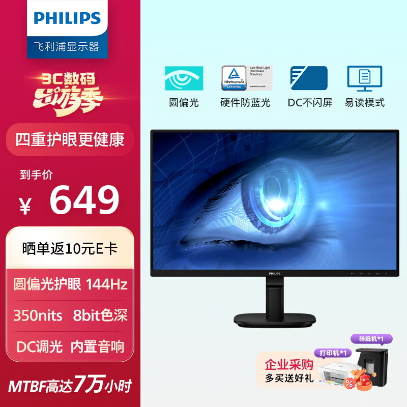 飞利浦 24B2N2200G 显示器开启预约:23.8 英寸 1080P 144Hz IPS 面板,649 元
