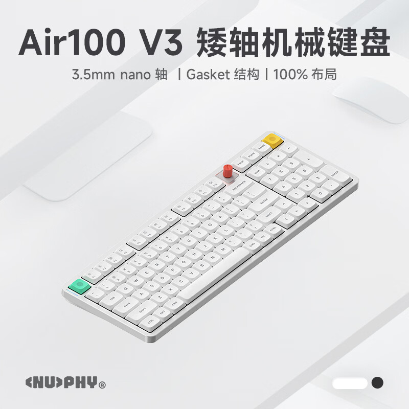 京东 NuPhy Air 100 V3 键盘 白色 749 元直达链接该键盘搭载 MX 轴脚设计的 3.5mm 键程矮轴,兼容一般高轴轴座。其轴体全面采用 POM 材质,可选 42gf“踩雪音 · 轻静”黛粉轴、45gf“麻将音 · 柔滑”超红轴、50gf“石子音 · 翠感”超茶轴。此外其键帽为 PBT 材质双色注塑工艺且字符原生适配 macOS,具有可拆卸自定义旋钮和韵律流光灯。